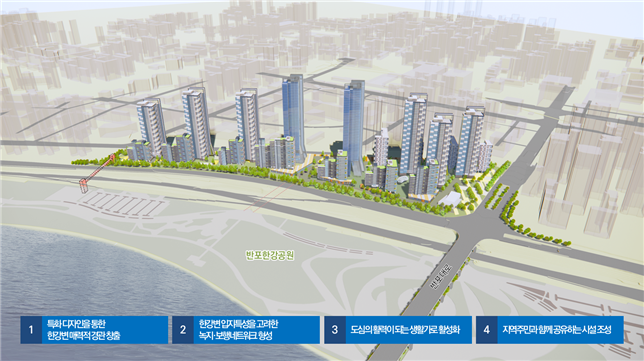 ¸ÕÀú ÇѰº¯¿¡ ±æ°Ô Á¢ÇÑ(¾à 600m) Ư¼ºÀ» °¨¾ÈÇØ, ´Ùä·Î¿î ½ºÄ«À̶óÀÎ ¹× °³¹æ°¨ È®º¸¸¦ À§ÇØ 30m ÀÌ»óÀÇ Åë°æÃàÀ» ¿°í °ø°øº¸ÇàÅë·Î º¯À¸·Î µðÀÚÀΠƯȵ¿À» ¹èÄ¡Çß´Ù. âÀÇÀû¡¤Çõ½ÅÀû µðÀÚÀÎ ¼³°è ½Ã ³ôÀ̰èȹÀ» À¯¿¬ÇÏ°Ô Àû¿ëÇÔÀ¸·Î½á ¼¿ï°ú ÇѰÀ» »ó¡ÇÏ´Â ÀÔüÀû ½ºÄ«À̶óÀÎÀÌ Çü¼ºµÉ ¿¹Á¤ÀÌ´Ù.