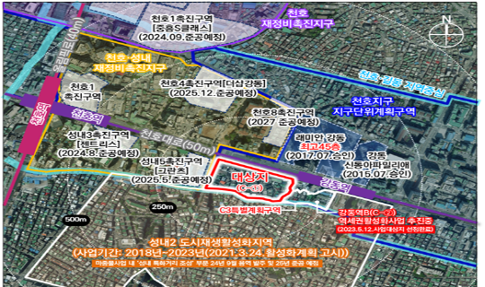 ¼­¿ï ÁöÇÏö 5È£¼±ÀÌ Áö³ª´Â °­µ¿¿ª ¿ª¼¼±Ç ÀÏ´ë°¡ ÃÖ°í 43Ãþ 1084¼¼´ëÀÇ ´ë±Ô¸ð´ÜÁö·Î Àç°³¹ßµÈ´Ù. °øµ¿ÁÖÅà 818¼¼´ë¸¦ Æ÷ÇÔÇØ ¿ÀÇǽºÅÚ 266¼¼´ë µî »ó¾÷¡¤¹®È­¡¤Ã¼À°½Ã¼³ÀÌ ÇÔ²²ÇÏ´Â º¹ÇÕ°ÇÃ๰·Î Á¶¼ºµÉ ¿¹Á¤ÀÌ´Ù.